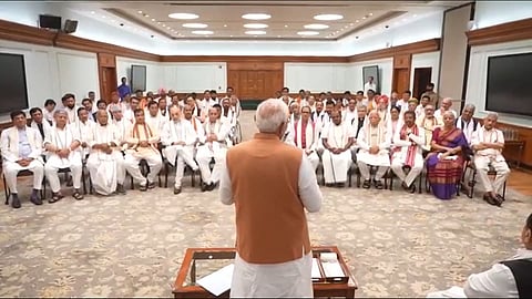 Narendra Modi Oath Taking Ceremony: पंतप्रधान मोदींच्या नेतृत्वाखालील नव्या सरकारचा सोमवारी सायंकाळी शपथविधी होणार आहे. त्यापूर्वी संभाव्य मंत्र्यांची एक बैठक पंतप्रधान नरेंद्र मोदी यांच्या निवासस्थानी संपन्न झाली. यावेळी मोदींनी शपथ घेणाऱ्या मंत्र्यांसोबत विविध विषयांवर चर्चा केली.