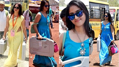 निळ्या वनपीस ड्रेसमधील ही महिला अधिकारी मध्यप्रदेशातील भोपाळ लोकसभा मतदारसंघातील गोविंदपुरा विधानसभा मतदारसंघातील एका बूथवर ड्युटीला असल्याचे सांगण्यात येत आहे. या महिला अधिकाऱ्याच्या हातात असलेल्या ईव्हीएम मशिनवर गोविंदपुरा विधानसभा मतदारसंघाचा क्रमांक लिहला असल्याचे दिसून येत आहे. दरम्यान, याआधी ईव्हीएम घेऊन जाणाऱ्या एका पिवळ्या साडीतील महिला अधिकाऱ्याचे फोटो सोशल मिडियावर व्हायरल झाले होते.