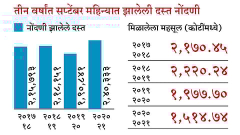कोरोना आणि आर्थिक मंदी यामुळे बांधकाम व्यवसायात मरगळ आली होती. त्याला चालना देण्यासाठी राज्य सरकारने डिसेंबर अखेरपर्यंत तीन टक्के मुद्रांक शुल्कात सवलत देण्याचा निर्णय घेतला. या निर्णयाची अंमलबजावणी सप्टेंबरपासून राज्यात सुरू झाली. विशेष म्हणजे २४ सप्टेंबरपर्यंत राज्यात १ लाख ५६ हजार ८६६ दस्त नोंदणी झाली होती. त्यातून सरकारला ८३६ कोटी ३१ लाख रूपये महसूल मिळाला होता. त्यांनतर सहा दिवसांत म्हणजे ३० सप्टेंबरपर्यंत एकूण दस्तांची संख्या २ लाख ४० हजार ३३३ वर गेली. या सहा दिवसांत तब्बल ८३ हजार ४६७ दस्तांची नोंद झाली. त्यातून ६७८ कोटी ४३ लाख रूपयांचा महसूल सरकारला मिळाला.