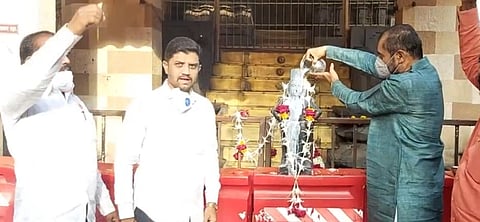 पंढरपूर (सोलापूर) : "राज्यातील तीन पक्षांचे सरकार हे मुके, बहिरे व आंधळे आहे. अशा सरकारला बा विठ्ठला, सु बुद्धी दे', असे साकडे रयत क्रांती संघटनेचे अध्यक्ष तथा माजी मंत्री सदाभाऊ खोत यांनी आज विठ्ठलाला घातले. गाईच्या दुधाला प्रतिलिटर 30 रुपये दर मिळावा, सरकारने प्रतिलिटर दुधाला 10 रुपये अनुदान द्यावे यासह इतर प्रमुख मागण्यांसाठी आज रयत क्रांती संघटनेच्या वतीने पंढरपुरात आंदोलन करण्यात आले आहे. आज सकाळी सदाभाऊ खोत यांनी संत नामदेव पायरीजवळ विठ्ठलाच्या मूर्तीला दुग्धाभिषेक घालून सरकार विरोधात आंदोलन केले. या वेळी मंत्री सदाभाऊ खोत यांच्यासह त्यांच्या कार्यकर्त्यांनी घोषणाबाजी केली.