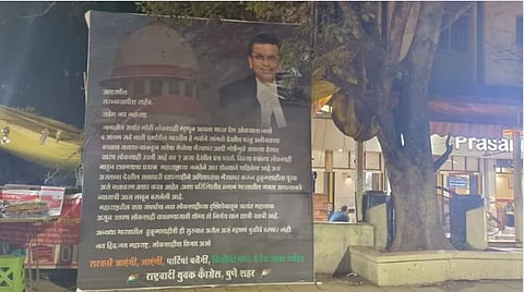 सत्तासंघर्षाची सुनावणी सरन्यायाधीश धनंजय चंद्रचूड यांच्या अध्यक्षतेखालील पाच सदस्यांचा खंडपीठाकडे सुरु होती. ही सुनावणी गुरुवारी पूर्ण झाली आहे. न्यायालयाने निकाल राखून ठेवला. परंतु या प्रकरणात पुणे शहरात बॅनर लावण्यात आले आहे. त्यातून देशाच्या सर्वोच्च न्यायालयातील न्यायाधीशांना पुणेरी स्टाईलने विनंती राष्ट्रवादी काँग्रेसने केली आहे. पुण्यात राष्ट्रवादीच्या कार्यकर्त्यांकडून न्यायाधीशांना बॅनर मार्फत विनंती करण्यात आली आहे.