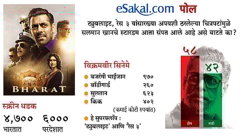 मुंबई - दरवर्षी रमजान ईद भाईजान सलमान खानच्या चाहत्यांसाठी फिल्मी मेजवानी ठरते. यंदाही सलमान त्याच्या चाहत्यांसाठी ‘भारत’ या चित्रपटाचे स्पेशल गिफ्ट घेऊन आला होता. सलमान, कतरिना कैफ यांच्या प्रमुख भूमिका असलेल्या या चित्रपटाचे प्रेक्षकांनी स्वागत केले. सकाळी आणि दुपारी या चित्रपटाचे काही शोज् हाउसफुल्ल होते. सिंगल स्क्रीन तसेच मल्टिप्लेक्समध्ये या चित्रपटाला देशभर संमिश्र प्रतिसाद मिळाला.