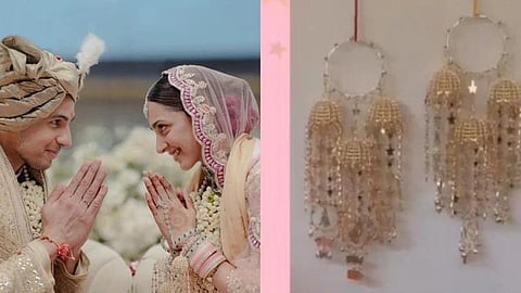 मनीष मल्होत्राच्या आऊटफिटमध्ये कियारा आणि सिद्धार्थ खूपच सुंदर दिसत होते. कियारानं पन्ना आणि हिऱ्याची ज्वेलरी परिधान केली होती. पण यात लक्ष वेधून घेत होते ते कियाराच्या हातातील कलीरा आणि हीऱ्याची अंगठी. आता चाहत्यांना जाणून घ्यायचं आहे यामध्ये असं काय खास आहे आणि याला कोणी बनवलं होतं.(Kiara Advani Kaliras glimpse of her lovestory with sidharth malhotra)