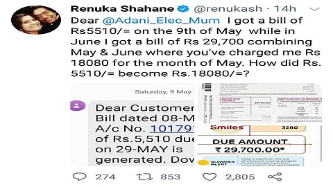 तापसी बरोबरच अभिनेत्री रेणुका शहाणे यांनाही एप्रिल महिन्याचे बिल 5510 तर मे आणि जून महिन्याचे एकत्रित बिल 29,700 असे आले असून फक्त मे महिन्यासाठी अदानी इलेक्ट्रिसिटीने त्यांना 18,080 रुपये आकारले आहेत असे सांगत रेणुका यांनी ट्विटरवर फोटो टाकत नाराजी व्यक्त केली आहे.