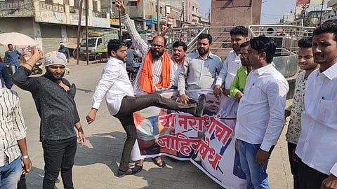 औरंगाबादः मराठा क्रांती मोर्चाच्या कार्यकर्त्यांनी केंद्र सरकार आणि गोयलच्या पुतळ्याचे दहन केले. पुस्तकावर तातडीने बंदी घातली पाहिजे, पुस्तकाचे लेखक जय भगवान गोयल यांच्यावर गुन्हा दाखल झाला पाहिजे अशी मागणी यावेळी कार्यकर्त्यांनी केली. मराठा क्रांती मोर्चातर्फे गोयल यांच्या विरोधात पुंडलिकनगर पोलीस ठाण्यातही तक्रार दिली. तसेच काही भाजप नेते, गोयलच्या प्रतिमेला जोडे मारण्यात आले.