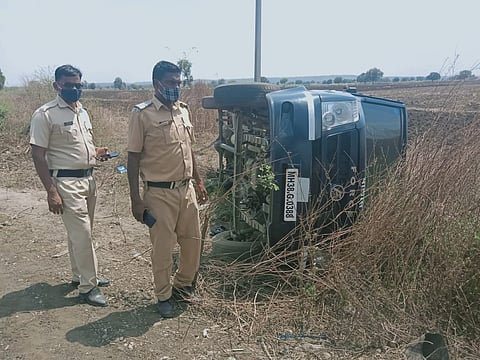 तेथे पंचनामा आटोपून सहाय्यक पोलिस निरीक्षक रवीकांत हुंडेकर, फोटोग्राफर दिगंबर शिंदे, चालक प्रकाश कांबळे व अन्य एक जण आखाडा बाळापूरकडे निघाले. पोलिसांचे वाहन आडा पाटीजवळ आले असतांना समोरुन वीट वाहतूक करणाऱ्या ट्रकचे स्टेअरींग रॉड तुटले. त्यामुळे वाहन चालकाचे ट्रक वरील नियंत्रण सुटले. हा ट्रक पोलिस वाहनावर येत असल्याचे दिसताच चालक कांबळे यांनी आपले पोलिस वाहन रस्त्याच्या खाली उतरवले. मात्र ट्रकचा धक्का लागल्याने पोलिस वाहन उटलले. या अपघातात श्री. हुंडेकर यांच्या पायाला दुखापत झाली तर शिंदेही यात जखमी झाले आहेत. यावेळी पाठीमागून वाहनाने येणाऱ्या ग्रामसेवक रुद्राजी क्षिरसागर, श्री. पोटे, साईनाथ छत्रे, शेख हारुण यांनी त्यांचे वाहन थांबवून पोलिस वाहनातील सर्वांना बाहेर काढले. जखमी झालेल्या शिंदे यांना उपचारासाठी आखाडा बाळापूरच्या ग्रामीण रुग्णालयात दाखल केले आहे. या अपघातानंतर ट्रक चालक मात्र फरार झाला आहे.