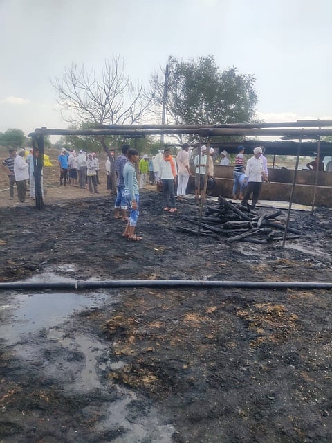 काही जनावरांनी बांधलेली दावे तोडून पळ काढली. मात्र, ज्यांची दावे तुटली नाहीत त्या पाच गायी भाजल्या गेल्या, तर एक गाय व एक गोरा दगावला आहे. तसेच गोठ्यात असलेले शेती साहित्य, जनावरांची वैरण, टीनपत्रे जळून अंदाजे एक लाखाच्यावर नुकसान झाले आहे. आगीचे नेमके कारण मात्र कळू शकले नाही. यामुळे शेतकरी आर्थिक अडचणीत सापडले आहेत. शेतकऱ्यांनी नुकसान भरपाईची मागणी केली आहे.