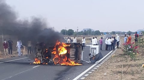 त्यात काही समजण्यापूर्वीच कारने पेट घेतला.आग लागल्याचे पाहून टोलनाक्यावरील नागरिकांसह माळीवाडी व भोकरवाडी फाटयावरील ग्रामस्थांनी घटनास्थळी धाव घेऊन तातडीने कार विझवून, कारचे दरवाजे उघडून त्यातील पाच जणांना बाहेर काढले. यात पल्लवी वसंत सुरवसे, गोविंद वसंत सुरवसे, प्रथमेश बालाजी शिरसाठ हे तिघे जण गंभीररित्या भाजले, तर मीराबाई बालाजी शिरसाठ व प्रतीक बालाजी शिरसाठ हे किरकोळरित्या होरपळले.