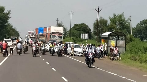 महालगाव (जि.औरंगाबाद) : रामकृष्ण उपसा सिंचन योजना सुरु कारावी व शेतकर्यांच्या सातबारावरील कर्जमाफ करावे यासह विविध मागण्यांसाठी वैजापूर-गंगापूर रस्त्यावरील भगुर फाटा (ता.वैजापूर) येथे तालुक्यातील (Vaijapur) १४ गावांच्या शेतकर्यांनी (Farmer) रास्ता रोको आंदोलन आज बुधवारी (ता.१३) केले. रास्ता रोको आंदोलनात रस्त्याच्या दोन्ही बाजूंने वाहनांच्या रांगा लागल्या होत्या. यामुळे वाहतुकीस खोळंबा झाला होता. यावेळी तहसीदार यांनी या प्रश्नी शासनस्तरावर वरिष्ठांना (Aurangabad) कळवुन मार्गी लावू असे आश्वासन दिले. त्यानंतर निवेदन देऊन रास्ता रोको आंदोलन मागे घेण्यात आले.