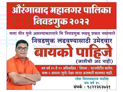 रमेश विनायकराव पाटील यांनी हे बॅनर लावले आहे. मला तीन मुले असल्याने मी निवडणूक लढवण्यासाठी कायद्याच्या चौकटीत बसत नाही. त्यामुळे निवडणूक लढवण्यासाठी बायको पाहिजे. त्यासाठी कुठलीही जातीची अटक नाही. कुठल्याही जातीची महिला चालेल. वय वर्ष २५ ते ४० वयोगटातील अविवाहीत, विधवा किंवा घटस्फोटीत महिला चालेल. पण, त्यात एक अट ठेवण्यात आली आहे. या महिलांना दोनच अपत्य असावी. जास्त असेल तर त्या महिलांना स्वीकारण्यात येणार नाही, असं या बॅनरवर लिहिलं आहे.