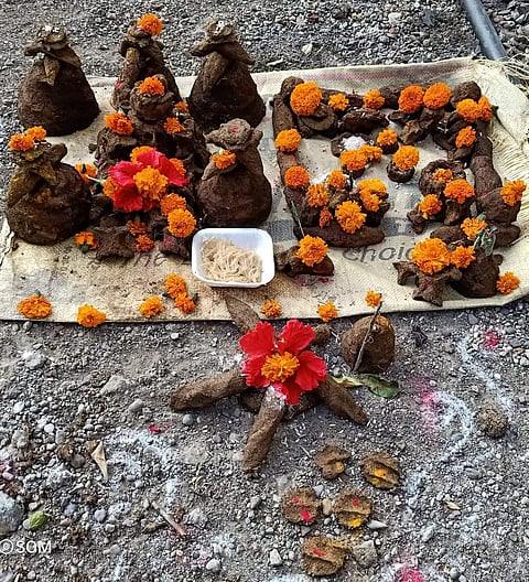 पूर्णा (परभणी) : गायीच्या शेणापासून पाच पांडव आणि गायवाडा भाऊबीजेच्या दिवशी सकाळी सकाळी घराच्या अंगणात साकारण्याची परंपरा महाराष्ट्रात आहे. राज्यातील प्रत्येक कुणब्याच्या घरासमोर ही कलाकृती साकारल्या जातेपिंपळा लोखंडे येथील पार्वती रावसाहेब लोखंडे आणि मंजुषा कुसळे यांनी आपल्या अंगणात तो साकारला .