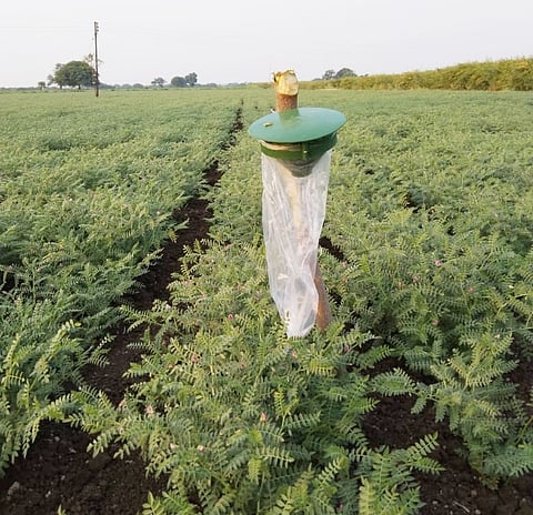 यंदा हरभऱ्याचा पेरा अधिक आहे. हरभरा पिकावरील घाटे अळीचे प्रमाण किती, त्यानंतर कराव्या लागणाऱ्या उपाययोजनासंदर्भातील अंदाज घेण्यासाठी कामगंध सापळा प्रकल्प जात आहे. सापळ्यात सात पेक्षा अधिक पतंग अडकले तर अळींचे प्रमाण वाढले असे समजावे. त्यानंतर अधिक प्रादुर्भाव रोखण्यासाठी निंबोळी अर्क किंवा क्वीनोलपोस (२० टक्के) २० मिली प्रतिदहा लिटर पाण्यात मिसळून फवारणी करावी जेणेकरुन अळ्या नष्ट होतील.