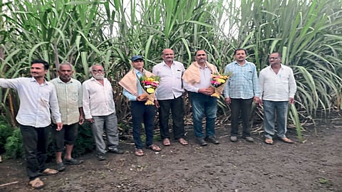 वाशी : येथील प्रगतशील शेतकरी तथा सेवानिवृत्त उपविभागीय पोलिस अधिकारी गोविंदराव पवार यांनी शेतात लागवड केलेल्या व्हीएसआय १८१२१ या उसाच्या नविन सुधारित वाणाच्या प्लॉटला वसंतदादा शुगर इन्स्टिट्यूटचे शास्रज्ञ डॉ. रमेश हाफसे यांनी नुकतीच भेट देऊन उसाची पाहणी करून समाधान व्यक्त केले. या वेळी शेतकऱ्यांच्या वतीने डॉ. हाफसे यांचा सत्कार करण्यात आला.