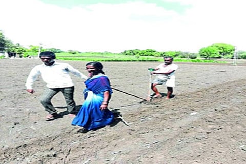 चाकूर (जि.लातूर) : मॉन्सूनच्या आगमनामुळे शेतकऱ्यांनी पेरणीला सुरवात केली; परंतु ट्रॅक्टर व बैलाच्या साहाय्याने पेरणी करू शकत नसल्यामुळे वडगाव एक्की (ता.चाकूर) येथील अल्पभूधारक शेतकऱ्याला आपल्या दिव्यांग मुलगा व पत्नीच्या सहकार्यातून पेरणी उरकून घ्यावी लागली. वडगाव एक्की येथील अशोक सोपान कदम यांना फक्त ३५ गुंठे जमीन आहे. शेतातील पत्र्याच्या शेडमध्ये त्याचे घर असून, दिवसभर शेतातील कामासह मजुरी करून ते कुटुंबाचा उदरनिर्वाह भागवितात. शेतीच्या उत्पन्नातूनच त्यांनी दोन मुलींचे विवाह केले आहेत.