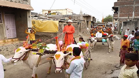 घनसावंगी (जि.जालना) : घनसावंगी (Ghansawangi) तालुक्यातील अव्वलगाव बुद्रुक येथे नुकताच एक विवाह सोहळा पार पडला. या आधुनिक युगात वऱ्हाड चक्क बैलगाडीतून आल्याने तालुक्यात हा विवाह सोहळा चर्चेचा विषय ठरला आहे. अव्वलगाव बुद्रुक येथे नुकताच १५ एप्रिल रोजी अंकुशराव पवार यांचे चिरंजीव नागनाथ पवार व कचरू निचळ यांची कन्या वर्षा निचळ यांचा विवाह सोहळा पार पडला. विवाह (Wedding) सोहळा म्हटले की प्रसिध्दी मिळवण्यासाठी कुणी आलिशान गाड्या तर कुणी हेलिकॉप्टरचा उपयोग करतात. (Groom And His Relatives Arrived Wedding Venue By Bullock Cart In Ghansawangi Of Jalna District)