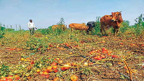 वारंगा फाटा(जि. हिंगोली): कोरोनाच्या पार्श्वभूमीवर करण्यात आलेल्या लॉकडाउनचा सर्वाधित फटका शेतकऱ्यांना बसला आहे. उत्पादित झालेला शेतमाल विक्री करण्यात अडथळे येत असल्याने दांडेगाव(ता. कळमनुरी) येथील शेतकऱ्यांने टोमॅटो पिकात जनावरे सोडली आहेत.