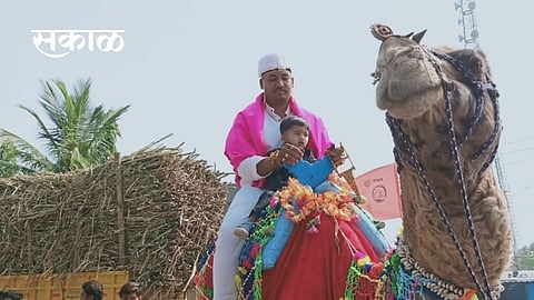 केज (बीड): कोरोनाच्या पार्श्वभूमीवर मित्रांपासून सोशल डिस्टन्स ठेवण्यासाठी नवरदेवांची वरात पारंपारिक पद्धतीने घोड्यावरून काढण्याऐवजी चक्क उंटावर बसून काढण्यात आली. त्यामुळे वऱ्हाडी मंडळीत चांगलीच चर्चा रंगल्याचे दिसून आले.