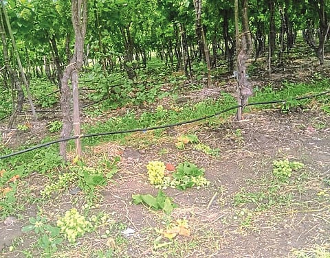 अनेक ठिकाणी द्राक्षांचे घड तुटून जमिनीवर सडा पडला आहे. या नुकसानीमुळे शेतकरी आर्थिक अडचणीत आला आहे. या जोरदार अवकाळी पावसामुळे गावातील रस्त्यावर मोठ्या प्रमाणात पाणी वाहिले, तर शिवारात ठिकठिकाणी झाडे व विजेचे खांब पडल्याने वीजपुरवठा खंडित झाला आहे. बुधवारी दुपारपर्यंत वीजपुरवठा सुरळीत झाला नव्हता.