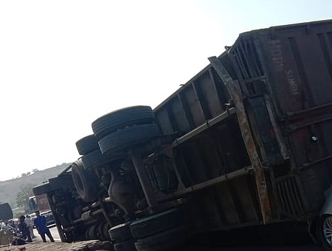 नळदुर्ग (जि.उस्मानाबाद) : सोलापूर-हैदराबाद राष्ट्रीय महामार्गावरील नळदुर्गजवळील (जि.उस्मानाबाद) आपल घर येथील घाटात रविवारी (ता.२४) दुपारी तीन वाजण्याच्या सुमारास सोलापूरकडे जाणाऱ्या कंटेनरच्या (एमएच ४६ एआर ३२३०) चालकाचा ताबा सुटल्यामुळे कंटेनर पलटी झाला. या अपघातात नळदुर्ग येथील पशुपालक मच्छिंद्र जाधव यांच्या मालकीच्या तीन म्हशी चिरडून ठार तर एक म्हैस जखमी झाली. तसेच पाठीमागून येणारी कार (केए ५३ एमसी ३६५५) पलटलेल्या कंटेनरवर आदळली. यामुळे राष्ट्रीय महामार्गावर तीन तास वाहतूक कोंडी झाली होती.