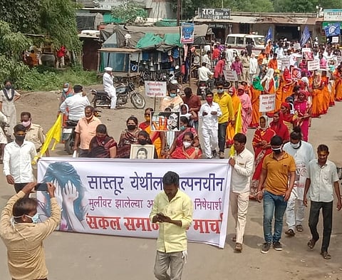 तहसील कार्यालयावर निघालेल्या मोर्चाचे सभेत रूपांतर झाले. यावेळी अनेक महिलांनी या सामूहिक अत्याचाराच्या घटनेचा आपल्या भाषणातून तीव्र शब्दात निषेध केला. नऊ वर्षांची मुलगी श्रीदुर्गा लांडगे हिने आपल्या भावनांना वाट मोकळी करून दिली. त्यानंतर प्रभारी तहसीलदार रोहन काळे यांना निवेदन देण्यात आले. तीनही आरोपींवर पोक्सा कायद्याअंतर्गत गुन्हा दाखल करून जलदगती न्यायालयात हे प्रकरण चालवून पीडितेला न्याय द्यावा, तिचे आर्थिक व मानसिक पुनर्वसन करावे, पीडित कुटुंबाला पोलिस संरक्षण द्यावे, आदी मागण्या तहसीलदार यांना दिलेल्या निवेदनात केल्या आहेत.