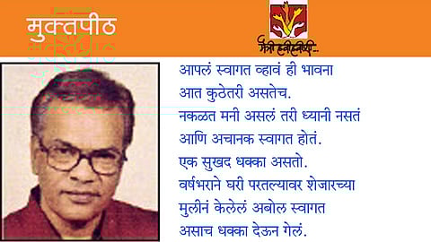 आपलं स्वागत व्हावं ही भावना आत कुठेतरी असतेच. नकळत मनी असलं तरी ध्यानी नसतं आणि अचानक स्वागत होतं. एक सुखद धक्का असतो. वर्षभराने घरी परतल्यावर शेजारच्या मुलीनं केलेलं अबोल स्वागत असाच धक्का देऊन गेलं.