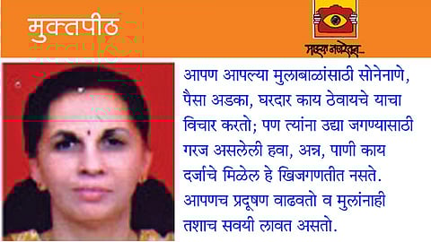 आपण आपल्या मुलाबाळांसाठी सोनेनाणे, पैसा अडका, घरदार काय ठेवायचे याचा विचार करतो; पण त्यांना उद्या जगण्यासाठी गरज असलेली हवा, अन्न, पाणी काय दर्जाचे मिळेल हे खिजगणतीत नसते. आपणच प्रदूषण वाढवतो व मुलांनाही तशाच सवयी लावत असतो.