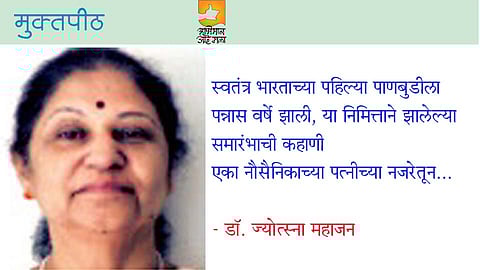 पन्नास वर्षांपूर्वी, आठ डिसेंबर 1967 रोजी रशियाच्या किनाऱ्यावर रिगा येथे पहिली पाणबुडी दिमाखदार सोहळ्यात भारतीय नौदलात समाविष्ट झाली होती; पण हा समारंभ भारताबाहेर झाला होता. याच पाणबुडीवर माझे पती अभियंता म्हणून काम करत होते. हा दिवस "पाणबुडी दिवस' म्हणून साजरा होतो. टपाल खात्याने "पनडुब्बी दिन' म्हणून तिकीट काढले. महावीरचक्र प्राप्त कॅप्टन सामंत यांच्या नावाने काढलेले तिकीटही त्यांच्याच हस्ते प्रकाशित करण्यात आले. अतिशय अभिमानास्पद अशा या समारंभांना उपस्थित राहण्याचे भाग्य मला लाभले. आता पाणबुडी शाखेला "कलर निशान' देण्याची वेळ जवळ आली होती. नौसैनिकांचे संचलन, ती शिस्त, आसन व्यवस्थेपासून ते निवेदनापर्यंत प्रत्येक गोष्टीचे नेटके आयोजन होते.