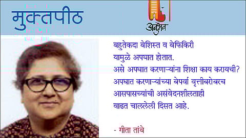 बहुतेकदा बेशिस्त व बेफिकिरी यामुळे अपघात होतात. असे अपघात करणाऱ्यांना शिक्षा काय करायची? अपघात करणाऱ्यांच्या बेपर्वा वृत्तीबरोबरच आसपासच्यांची असंवेदनशीलताही वाढत चाललेली दिसत आहे.