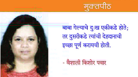 नववर्षाच्या स्वागतास जगभर उधाण आलेले असताना, आमच्या घरावर शोककळा पसरली होती. माझे वडील पांडुरंग वाईकर गेले बारा दिवस रुग्णालयात मृत्यूशी झुंजत होते. मेंदूत रक्तस्राव झाला होता. गेले तीन दिवस प्रतिसाद हळूहळू कमी पडत चाललेला. बाबा गेले. एकीकडे बाबांच्या निधनाचे दुःख होते; पण त्याच वेळी त्यांची इच्छा पूर्ण करण्याची जबाबदारी माझ्यावर येऊन पडली होती. त्यांनी मरणोत्तर देहदानाच्या इच्छापूर्तीची जबाबदारी मुलगी म्हणून माझ्यावर टाकली होती. अशा कठीण परिस्थितीमध्ये आईच्या संमतीने सर्व नातलगांशी बोलून मला हा निर्णय लवकरात लवकर घ्यायचा होता. ‘दादांची इच्छा’ महत्त्वाची या गोष्टीला प्राधान्य देत सर्वांनी सकारात्मक प्रतिसाद दिला. आता मला पुढील सोपस्कारांची लढाई लढायची होती. डॉक्टरांच्या सहकार्याने ‘सिम्बॉयोसिस मेडिकल कॉलेज फॉर गर्ल्स’च्या डॉ. वैशाली भारंबे यांच्याशी मी संपर्क साधला. त्याही परिस्थितीत डॉ. वैशाली यांनी माझे प्रथम सांत्वन केले व देहदानासाठी आवश्यक त्या कागदपत्रांची माहिती दिली. मृत्यूचे प्रमाणपत्र व दाखला चुलत भाऊ प्रसाद व सख्खा भाऊ राजेश यांनी मिळवला. तोवर संध्याकाळचे सहा वाजले होते. शोकाकुल सर्वांनी बाबांचा निरोप घेतला. आता मात्र माझ्या दुःखाचा बांध फुटला.