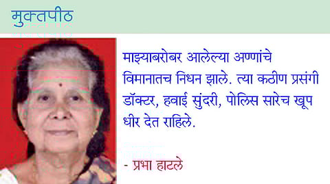 ंमाझ्या हाताची थरथर तिच्या लक्षात आली. तिने खुणेने डॉक्टरांना बोलावले. माझा रक्तदाब तपासला. मला विचारून माझ्या पर्समधील गोळी दिली. पुन्हा अर्ध्या तासाने डॉक्टरांनी माझे बीपी तपासले. हवाई सुंदरीने थोड्या वेळाने माझा जबाब नोंदवला. त्यांना काय औषधे दिली, काय जेवण दिले. स्वतः काय इतर खाल्ले का? वगैरे. अजून तीन तास घालवायचे होते. विमान सॅन फ्रान्सिस्कोला उतरले. विमानातील सर्व प्रवाशांना थांबवण्यात आले. विमानाजवळ एक खास गाडी आली. त्यातून सात-आठ पोलिस अधिकारी दोन कुत्री घेऊन आले. मग अण्णांचा देह खाली नेला. नंतर एक महिला पोलिस अधिकारी आणि विमानतळावरील प्रमुख अधिकारी माझ्याकडे आले. तुम्ही नातेवाईक असल्याने तुमच्याशी थोडे बोलायचे आहे, अशी विनंती केली. माझ्याकडून प्राथमिक माहिती घेतली गेली. दुसऱ्या बाजूने इतर प्रवाशांना सोडण्यात आले. सर्व जण शांतपणे निघून गेल्यावर शेवटी मला गाडीतून नेले. मला सांगितले, की तुम्ही काहीच काळजी करू नका. त्यांनीच माझ्या जावयाला बोलावून कल्पना दिली. अण्णांचे कॅबीन लगेज सील करून घेऊन गेले. नंतर तिसऱ्या दिवशी अण्णांचे सामान दिले. पाचव्या दिवशी आलिशान सजविलेल्या गाडीने मृतदेह स्मशानभूमीत दोन अधिकारी घेऊन आले. दहनविधी होताना सॅल्युट केला. कठीण समयी किती चांगले वागले हे सारे!