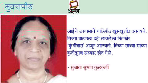 आईचे उपवासाचे थालिपीठ खुसखुशीत असायचे. तिच्या ताटातला दही लावलेला नितकोर "कुंतीघास' अजून आठवतो. तिच्या साध्या साध्या कृतीतूनच संस्कार होत गेले.