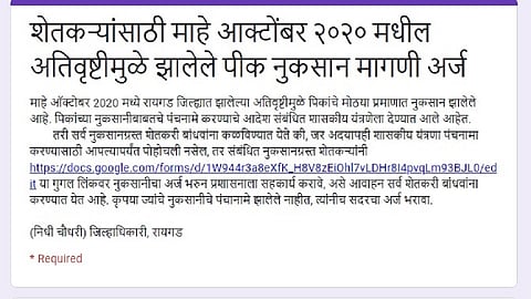 ज्यांचे पंचनामे झाले नाहीत, अशा नुकसानग्रस्त शेतकऱ्यांनीच https://docs.google.com/forms/d/1W944r3a8eXfK_H8V8zEiOhl7vLDHr8I4pvqLm93BJL0/edit या गुगल लिंकवर नुकसानीचा अर्ज भरावा, असे आवाहन जिल्हाधिकारी निधी चौधरी यांनी केले आहे. सध्या अनेक गावांत इंटरनेट सुविधा नाही. सर्वच शेतकऱ्यांकडे मोबाईल सुविधा नाही. काहींना असे अर्ज भरता येणे शक्य होणार नाही, त्यामुळे शेतकऱ्यांना शहरात सायबर कॅफेत येऊन असे अर्ज भरावे लागणार आहेत. यात शेतकऱ्यांचा वेळ व खर्च वाया जाणार आहे. गावातील ऑनलाईन शिक्षणासारखी शेतकऱ्यांची अवस्था झाली आहे. यामुळे शेतकरी नुकसानीपासून वंचित राहू शकतो. यासाठी गावस्तरावर पंचनामे व्हावेत, अशी शेतकऱ्यांची मागणी आहे.