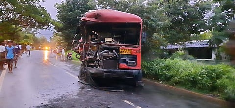 विक्रमगड : विक्रमगड-पाली मार्गावर वाकडुपाडा येथे महाराष्ट्र परिवहन महामंडळाची बस आणि कंटेनर यांच्यात समोरासमोर धडक होऊन भीषण अपघात झाला आहे. या अपघातात बस चालकासह कंटेनर चालक आणि 11 जण जखमी झाले आहेत. जखमींना पोलिस आणि स्थानिकांच्या मदतीने विक्रमगडच्या शासकीय रुग्णालयात उपचारासाठी दाखल करण्यात आले आहे. या अपघातात कंटेनर चालक किरकोळ जखमी झाला आहे. बस आणि कंटेनरचे यात मोठे नुकसान झाले आहे. हा अपघात गुरुवारी संध्याकाळी 6.45 ते 7 च्या दरम्यान झाला.