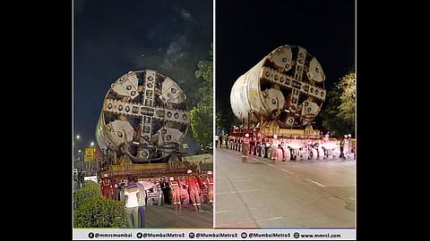 मुंबई : मुंबईत वेगाने मेट्रोची कामं सुरु आहेत. अशात मुंबईत जमिनीखाली २० ते २५ मीटर खाली बोगदा (टनेल) बनवण्याचं काम सुरु आहे. हे बोगदे बनवण्याचं महाकाय मॉन्स्टर मशीन कायम जमिनीखाली असतं मात्र पहिल्यांदाच मुंबईच्या रस्त्यावरून हे अवाढव्य असं टनेल बोअरिंग मशीन (TBM) नेण्यात आलं. अगदी काही मिनिटांचा रस्ता पार करण्यासाठी या मशीनला तब्बल पाच तासांचा कालावधी लागलाय.