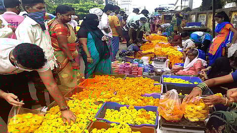शिवडी : कोरोनाच्या पार्श्वभूमीवर (corona) यंदा गरबा खेळण्यावर बंदी (garba restrictions) असली तरी अनेक मंडळांत कोरोनाचे नियम (corona rules) पाळत नवरात्रोत्सव साजरा (navratri festival) करण्यात येत आहे. शुक्रवारी (ता.१५) दसरा असल्याने फुले, तोरे आणि आपट्यांच्या पानांची खरेदी (flowers purchasing) करण्यासाठी दादर फूल बाजारात (dadar market) कोरोनाला न जुमानता ग्राहकांची झुंबड (consumer) उडाली होती.