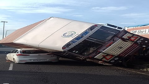 प्रवीण यशवंत पाटील (४५) आई-वडिलांसह उर्से येथे निघाले असताना शनिवारी (ता. २१) सकाळी ९ वाजता चारोटी उड्डाणपुलावर विरुद्ध मार्गिकेवरून नियंत्रण गमावलेला कंटेनर त्यांच्या कारवर कोसळला; मात्र या अपघातात कारमधील तिघे प्रवासी बचावले असून त्यांना किरकोळ दुखापत झाली आहे.