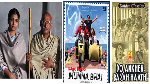 राजकुमार हिराणी यांचा लगे रहो मुन्नाभाई हा व्यावसायिक पठडीतील विनोदीपट. मुरली शर्मा ऊर्फ मुन्ना (संजय दत्त) व सर्किट (अर्शद वारसी) हे दोघे गुंड. मुन्नाचे रेडिओ जॉकी जान्हवी (विद्या बालन) हिच्यावर प्रेम जडते. आपण इतिहासाचे प्राध्यापक असल्याचे तो तिला सांगतो. एके दिवशी ती तिच्या वृद्धाश्रमात गांधीविचारांवर बोलण्यासाठी आमंत्रित करते. त्यासाठी मुन्ना ग्रंथालयात जाऊन दिवस-रात्र गांधीजींविषयीची पुस्तके वाचतो. परिणामी मुन्नाला आपल्या आसपास गांधी असल्याचा भास होऊ लागतो. बापूजी त्याला अहिंसा व सत्याच्या मार्गाने जाण्यासंबंधी प्रवृत्त करतात. एके दिवशी एक बांधकाम व्यावसायिक जान्हवी व निराधार ज्येष्ठ नागरिक राहत असलेला बंगला बळकावतो.