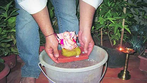 ठाणे : गणपती बाप्पाच्या आगमनाला काही तास उरले असून कोरोनाच्या पार्श्वभूमीवर प्रशासन देखील सज्ज झाले आहे. हल्ली सर्रास पीओपीच्या (प्लॅस्टर ऑफ पॅरीस) गणेशमूर्ती पुजल्या जात असल्याने विर्सजनानंतर पाण्यात पीओपीचे विघटन होत नसल्याने मूर्तीची विटंबना होण्याची शक्यता असते. त्यामुळे हे टाळण्यासाठी ठाणे महापालिका आयुक्त विपिन शर्मा यांच्या संकल्पनेतून घरच्या घरी पाण्यामध्ये अमोनियम बायोकार्बोनेट हे रसायन मिसळून विसर्जन करण्याचे आवाहन करण्यात आले आहे.