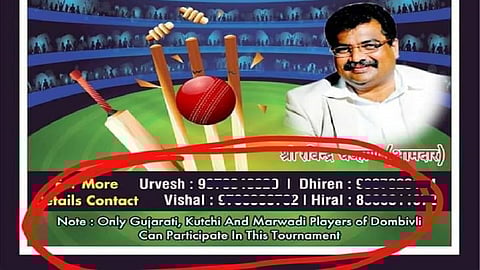 नमो रमो ट्रॉफी असं या क्रिकेट स्पर्धेचं नाव आहे. धक्कादायक बाब म्हणजे या सामन्यांच्या पोस्टरमध्ये खाली एक न लिहिण्यात आली आहे. ज्यामध्ये स्पष्टपणे फक्त गुजराती, कच्छी आणि मारवाडी याच नागरिकांना सहभाग घेता येईल असं नमूद करण्यात आलं आहे. दरम्यान या स्पर्धेचं पोस्टर व्हायरल झाल्यानंतर या स्पर्धेच्या आयोजनाला कडाडून विरोध करण्यात येतोय.