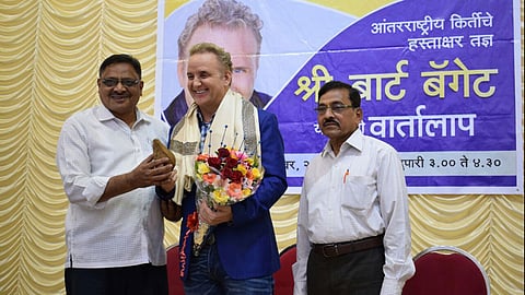 अध्यक्ष नरेंद्र वाबळे यांनी बार्ट बॅगेट यांचा स्वागत सत्कार करताना दिलेली शाल बॅगेट यांनी कार्यक्रमानंतरही तशीच गळ्यात ठेवली होती. त्यांना या शालीचे भारीच अप्रूप वाटत होते.