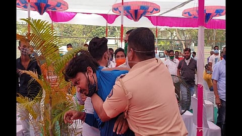 मुंबई: आयुक्त साहेब आम्हाला वेळ द्या, आयुक्त साहेब आम्हाला वेळ द्या असे म्हणत नगरविकास मंत्री एकनाथ शिंदे यांच्या कार्यक्रमात दोन मनसे कार्यकर्त्यांनी आज घोषणाबाजी करत राडा केला. मनसेच्या घोषणा भर कार्यक्रमात होताच तुलिंज पोलिस ठाण्याचे वरिष्ठ पोलिस निरीक्षक राजेंद्र कांबळे यांनी तात्काळ दोन्ही मनसे कार्यकर्त्यांना ताब्यात घेऊन बेदम चोप देत कार्यक्रमातून बाहेर काढण्यात यश मिळविले. मनसेच्या या घोषणाबाजीने काहीवेळ कार्यक्रमात तणावाचे वातावरण निर्माण झाले होते.