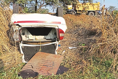 खालापूर शहरातून द्रुतगती मार्गाला जोडरस्ता असून, आठवड्यापूर्वी पहाटे वेगाने जाणारी कार जोगावडे वाड्यानजीक वळणावर वेग नियंत्रण न झाल्याने रस्ता सोडून दोन-तीन पलटी मारत शेतात पलटी झाली. कारमधील तिघांनी जखमी अवस्थेत कार सोडून पलायन केले. खालापूर पोलिसांनी कारचा पंचनामा केला आहे. आठवड्यानंतर ही कार अपघात ठिकाणी पडून असून, ब्रेडची पाकिटे आणि नायलॉन रस्सी