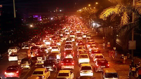 खारघर : खारघर हिरानंदानी पुलावर रस्त्यावर सिमेंट काँक्रीटीकरणाचे काम सुरू असल्यामुळे पनवेल-शीव महामार्गावर बेलापूर ते खारघरदरम्यान नेहमीच वाहतूक कोंडी होते. अशातच मंगळवारी (ता.३१) महामार्गावर मुुंबईकडून पनवेलच्या दिशेने जाणाऱ्या टेम्पोत बिघाड झाल्यामुळे रात्री साडेनऊ ते अकराच्या सुमारास सीबीडी ते उत्सव चौक आणि हिरानंदानी रस्त्यावर मोठ्या प्रमाणात वाहतूक कोंडी झाली होती. दोन किलोमीटरचा रस्ता पार करण्यासाठी एक ते दीड तास लागल्याने अनेकांना नवीन वर्षाचे स्वागत रस्त्यावरच करावे लागले. त्यामुळे नागरिकांकडून नाराजी व्यक्त करण्यात आली.