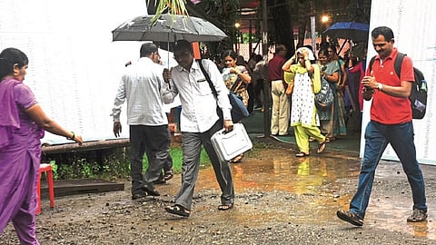विधानसभा निवडणुकीसाठी कर्मचाऱ्यांना मतदान यंत्रे आणि अन्य साहित्य घेऊन सकाळी १०.३० वाजल्यापासून मतदान केंद्राकडे निघणे आवश्यक होते. जिल्हाधिकारी डॉ. विजय सूर्यवंशी यांनी याबाबतचे नियोजन केले होते. परंतु पावसामुळे आज ही प्रक्रिया दुपारी साडेबारा वाजल्यानंतर सुरू झाली. काही एसटी आगारातून वेळेवर आल्या नाहीत. त्यामुळे कर्मचाऱ्यांनाही वेळेवर येण्यास उशीर झाला. तसेच स्ट्राँगरूममध्ये पावसामुळे चिखल झाला होता. त्याचा परिणाम निवडणूक प्रक्रिया सुरू होण्यास उशीर झाल्याचे अधिकाऱ्यांचे म्हणणे आहे. जिल्ह्यातील सातही मतदारसंघात ही प्रक्रिया उशिराने सुरू झाली.
