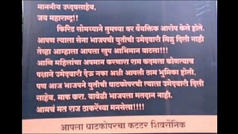 मुंबईः माननीय उद्धवसाहेब, जय महाराष्ट्र!! माफ करा. यावेळी भाजपला मतदान नाही. आमचं मत राज ठाकरेंच्या मनसेला!!! असे पोस्टर्स घाटकोपरमध्ये झळकले असून, सोशल मीडियावरही व्हायरल झाले आहेत.