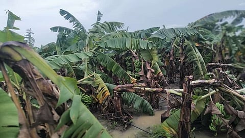 अर्धापूर (जि.नांदेड) : तालुक्यात (Ardhapur) गेल्या आठवड्यात अतिवृष्टीमुळे खरिपाचा हातातोंडाशी आलेला घास निसर्गाने हिरावून नेला आहे. या संकटातून सावरत असतानाच पुन्हा सोमवारी (ता.चार) दुपारी वादळी वाऱ्यासह पाऊस (Rain) झाल्याने कापणीस आलेल्या केळीच्या बागा उद्ध्वस्त झाल्या आहेत. तालुक्यातील गणपूर, कामठा, सावरगाव, कोंढा परिसरातील केळी उत्पादक शेतकऱ्यांना खूप मोठा आर्थिक फटाका बसला आहे.सततच्या निसर्गाच्या संकटात शेतकरी भरडला जात आहे. अर्धापूर तालुक्यातील तिन्ही मंडळांत अतिवृष्टी झाल्याने कापणीस आलेले सोयाबीनसह कापूस, हळद आदी पिकांचे खूप मोठे नुकसान झाले होते. या अस्मानी संकटातून शेतकरी (Nanded) सावरत असतानाच पुन्हा सोमवारी दुपारी तीन ते चार वाजण्याच्या सुमारास वादळी वाऱ्यासह पाऊस झाला. या वाऱ्यामुळे उभ्या पिकांचे खूप मोठे नुकसान झाले आहे. या वादळी वाऱ्याचा काढणीस आलेल्या केळीच्या बागांना फटाका बसला आहे.