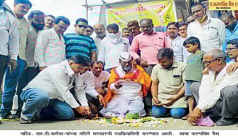 सरकारने एसटी कर्मचाऱ्यांच्या मागण्या मान्य केल्या जाव्यात. विशेषता एसटीचे राज्य सरकारमध्ये विलनिकरण व्हावे व संप मिटावा असे एसटी कर्मचारी संघटनेच्या प्रत्येक सदस्यांना वाटत आहे. मात्र एसटी कर्मचाऱ्यांच्या सर्व मागण्या मान्य होतील परंतु राज्य सरकारमध्ये विलनीकरण होणे सध्यातरी शक्यता नाही. त्यामुळे राज्य सरकार देखील कर्मचाऱ्यांना कामावर परत या म्हणून आवाहन करत आहे. परंतु कर्मचारी विलनिकरणाच्या एकाच मागणीवर ठाम आहेत. त्यामुळे एसटी महामंडळाचे प्रचंड नुकसान होत आहे. दुसरीकडे प्रवाशांना देखील प्रचंड मनस्ताप सहन करावा लागत आहे. नांदेड विभागाचे देखील यात दहा कोटीपेक्षा अधिकचे नुकसान झाले आहे. कर्मचाऱ्यांनी कामावर आले पाहिजे अशी आधिकारी यांची भावना आहे. मात्र त्याला न जुमानता एसटी कर्मचारी आंदोलन करत आहेत. पंधरा दिवसापासून बसलेल्या एसटी कर्मचारी यांनी एकत्र येत सरकारचे श्राद्ध घातले.