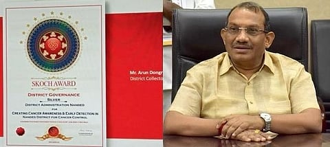 नांदेड : जिल्हा प्रशासनाच्यावतीने जिल्ह्यातील ग्रामीण भागात कर्करोगासंदर्भात जनजागृती निर्माण व्हावी यासंदर्भात राबविलेल्या मोहिमेला अखिल भारतीय पातळीवरील ‘डिस्ट्रीक्ट गव्हर्नन्स स्कोच अर्वाड’ देवून गौरव केला आहे. तत्कालीन जिल्हाधिकारी अरुण डोंगरे यांच्या टिमने मिळविलेल्या या यशाबद्दल पालकमंत्री अशोक चव्हाण यांनी ही मोहिम यशस्वी करणाऱ्या जिल्हा प्रशासनातील अधिकारी व कर्मचाऱ्यांचे अभिनंदन केले आहे.