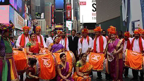 निमित्त होतं महाराष्ट्र आणि गुजरात दिनाचं. न्यूयॉर्कच्या उंच इमारतींच्यामध्ये भगवा डोलाने फडकत होता. 'जय महाराष्ट्र'च्या घोषणेने सारा टाइम्स स्क्वेअर परिसर दुमदुमत होता. सारे उपस्थित असलेले भारतीय आणि परदेशी बांधव लेझीम आणि ढोल ताशाच्या ठोक्यावर ताल धरत होते. लेझीम, ताशा, ढोल, झांन्झ यांचा सलग दोन तास गजर चालू होता तेही न्यूयॉर्कमध्ये.