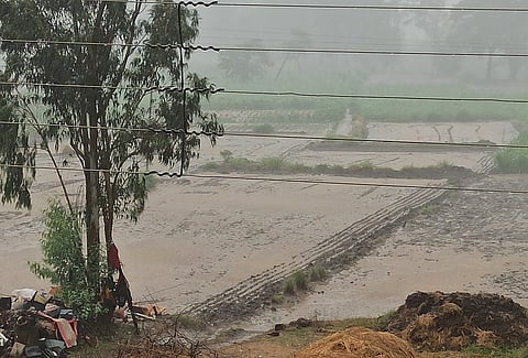 कोवाड (कोल्हापूर) : विजांचा कडकडाट व वादळी वाऱ्यासह चंदगडच्या पूर्वभागात आज जोरदार वळिव पाऊस झाला. तब्बल 40 मिनिटे झालेल्या पावसाने शिवार भरून वाहिलं. पावसात गवत गंज्या, गोवऱ्या व पत्र्यांच्या शेडचे नुकसान झाले.